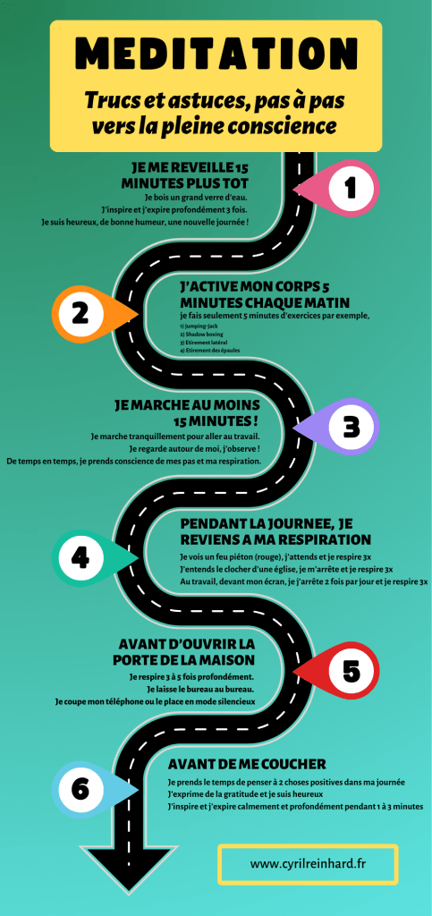 Dans ce premier post et cette infographie, je partage quelques astuces à intégrer à votre journée. N’hésitez pas à me faire part de vos commentaires sur leur mise en œuvre !